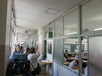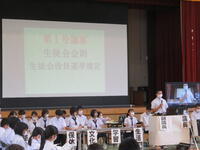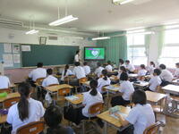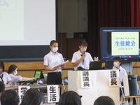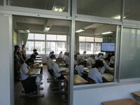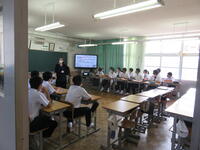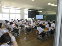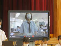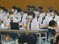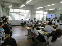 生徒は9時までに登校し、学年・学級での活動を行いました。次に10時から11時20分まで、図書室を主会場として各教室をリモートでつなぎ、平和集会を行いました。