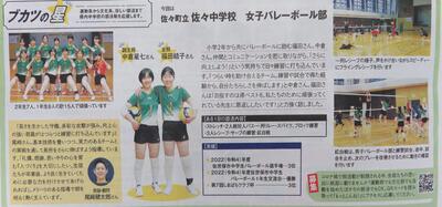 長崎新聞に女子バレーボール部が紹介されました 投稿: 校長 (2023/02/24) 2月22日の長崎新聞の別冊”とっとってmotto!” の『ブカツの星』コーナーで、女子バレーボール部が紹介されました。詳しくは、新聞をご覧ください。また、本校吹奏楽部についても、後日、取材終了後に紹介される予定です。 Tweet -